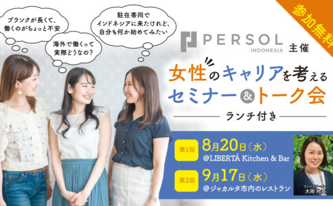 イベント・セミナー日本では求人サイトの「doda」でおなじみのPERSOLがインドネシアでのキャリアの“はじめの一歩”を応援するセミナー&トーク会を開催いたします。 当日は、実際に一歩を踏み出したロールモデルの先輩たちも参加し、海外就職の…