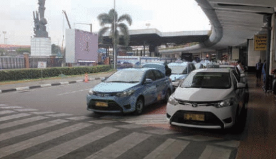 市内までのアクセス方法のひとつ。整理券を発行機から取って、到着ロビーの外のタクシー乗り場に並び、順番が来たら乗車します。料金の目安は15〜20万ルピア(別途高速料金)。渋滞にハマると料金が上がり、高速料金も別途なので場合によってはクーポンより高くかかるかもしれません。