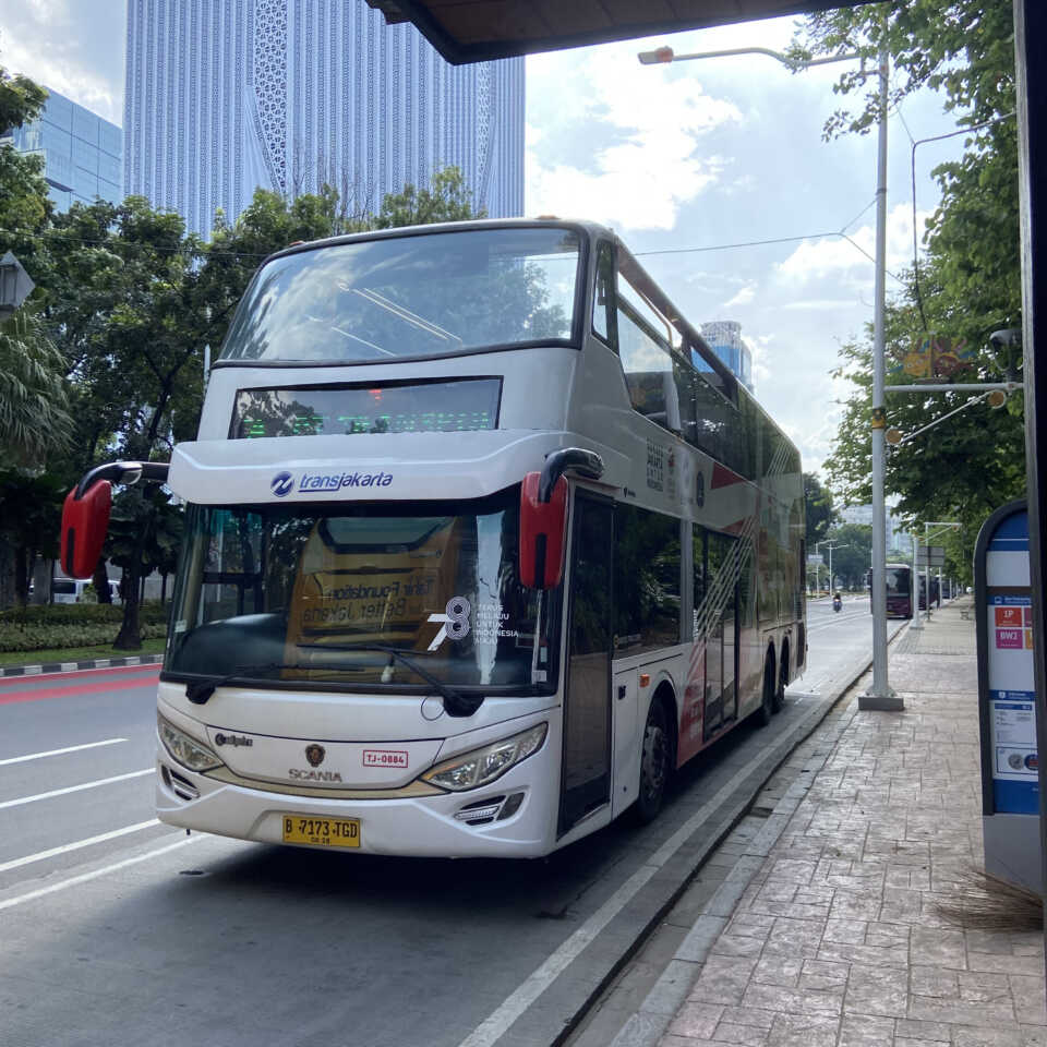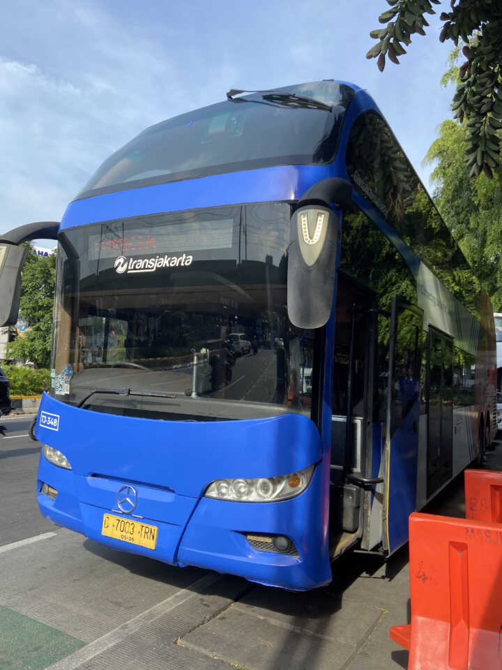 毎日午前10時から午後5時まで運行している2階建ての無料観光バス、トランスジャカルタ(TransJakarta)。今回はモナス記念塔前のバス停IRTI MonasからBW10路線に乗り、Juanda IstiqlalでBW1路線に乗り換え、インドネシア銀行博物館最寄りのバス停Museum BIまで行ってみました。