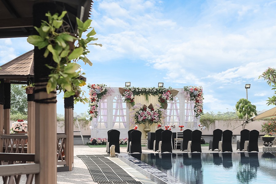 中二階に位置するプールは、暖かな日差しと程よい日陰の心地よいリフレッシュ空間。お子様が目の届く範囲で遊べるため、親御様も安心して見守れます。白を基調とした美しい空間は、結婚式の会場としても利用されることも多いです。青い空と広大な土地を背景に、特別な思い出を刻むことができます。