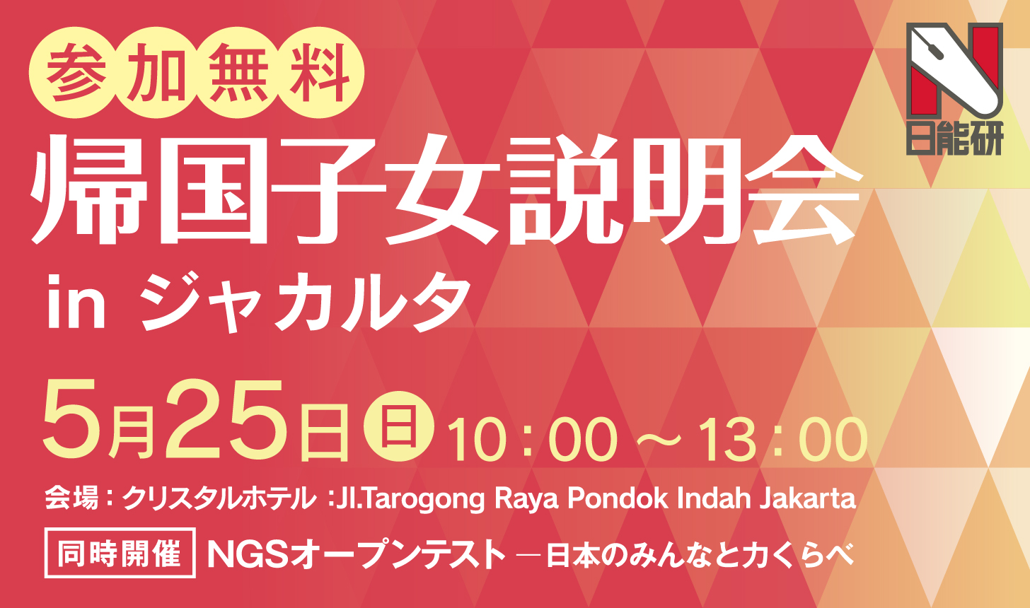 帰国子女説明会・NGSオープンテスト WEBサイトより: https://www.nichinoken.co.jp/ngs/ または(塾)ファイ PHI-JKT: phi@phojkt.com / 021-766-1114 |