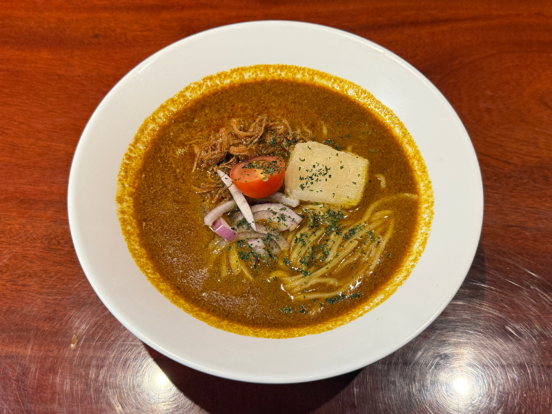 Rp. 98,00010種以上のスパイスを効かせたカレースープは、豚骨清湯をベースにしたあっさりとした仕上がり。豚頭から取ったタレを加え、シェフ独自のブレンドで香りとコクのバランスを整えている。トッピングにはプルドポークと揚げ餅を添え、食感と風味に変化を持たせた。ドロッとせずに後味も軽やかで、スープまで飲み干せる一杯。