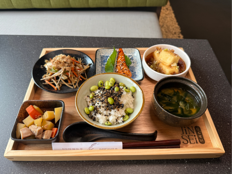 Rp.118,000++ふりかけ枝豆ご飯に、出汁の染みた鶏肉とごぼうのチンジャオロース、香ばしい焼き鮭、なめらかな絹豆腐の揚げ出し豆腐など、おかず18種類から3品、ご飯5種類から1品を選べる。味噌汁と小鉢も付き、栄養バランスの良い優しい味の定食は、心も体も満たしてくれる。組み合わせ次第で何度でも楽しめるランチを味わって。