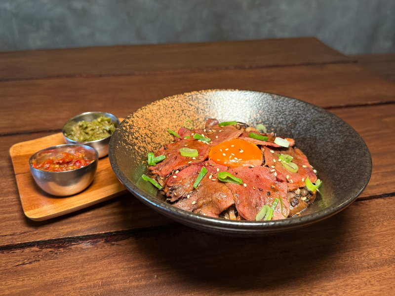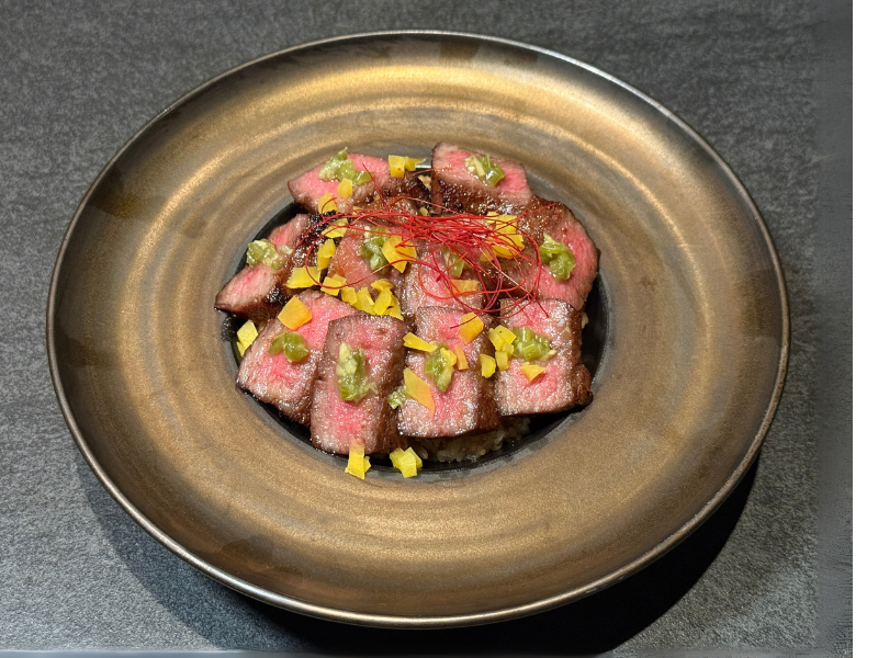Rp.770,000++A5西阿波牛のミスジまたはザブトンのみを使用した贅沢な丼ぶり。炭火でじっくり焼き上げ、醤油とリンゴベースの特製たれで仕上げた和牛は旨味たっぷり。ポン酢、醤油、ガーリックでさっぱりと味付けされたご飯と、トッピングのワサビや沢庵でさらに深みが増す。常連客限定のコンソメスープでお茶漬けとして楽しむも一興。