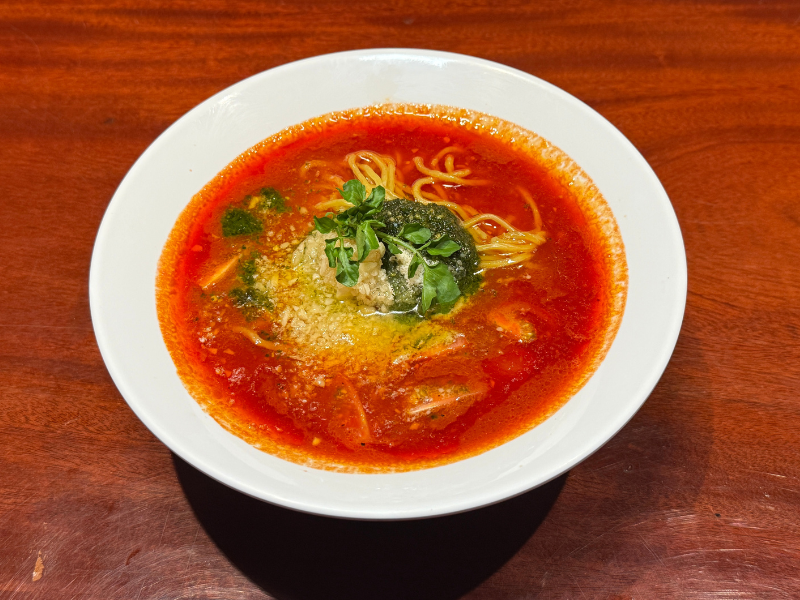 Rp.118,000→108,000鶏白湯とトマトジュースをブレンドしたスープに、エビオイルと塩ダレを加えた一杯。トマトの酸味と唐辛子の辛さが調和し、3段階から辛さの調整も可能。ニンニク・チーズが風味のアクセントとなり、自家製バジルペーストが全体を引き締める。豊かなコクと香りが重なり、満足感のある味わいに仕上がっている。