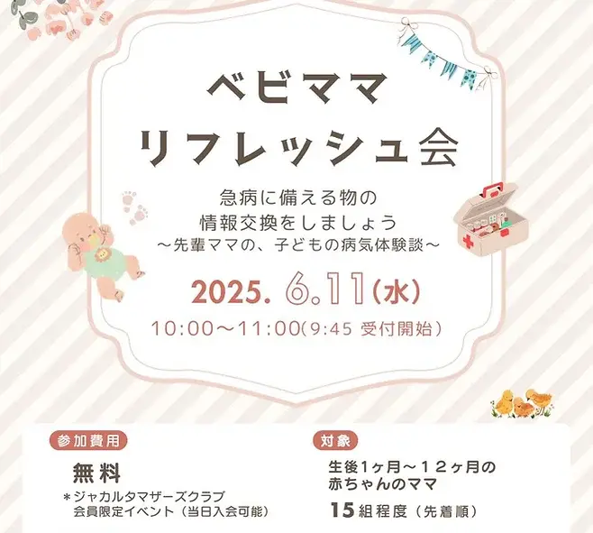 ジャカルタマザーズクラブ(JMC)プレママグループは、生後1ヶ月〜生後12ヶ月までのお子さんをお持ちの方を対象にしたベビママ交流会が開催予定。子どもの病気体験談や、急病に備えておくものに関する情報交換などを予定している。月齢の近いママ同士で、子育て中の困ったことや知りたいことなど、おしゃべり時間を楽しめる。