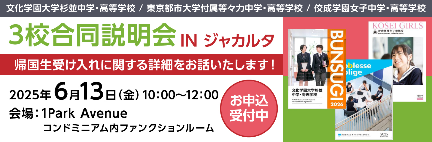 文化学園大学杉並中学・高等学校 / 東京都市大学付属等々力中学・高等学校 / 佼成学園女子中学・高等学校の3校が合同で学校説明会を開催する。当日は帰国生受け入れに関する詳細を説明予定。