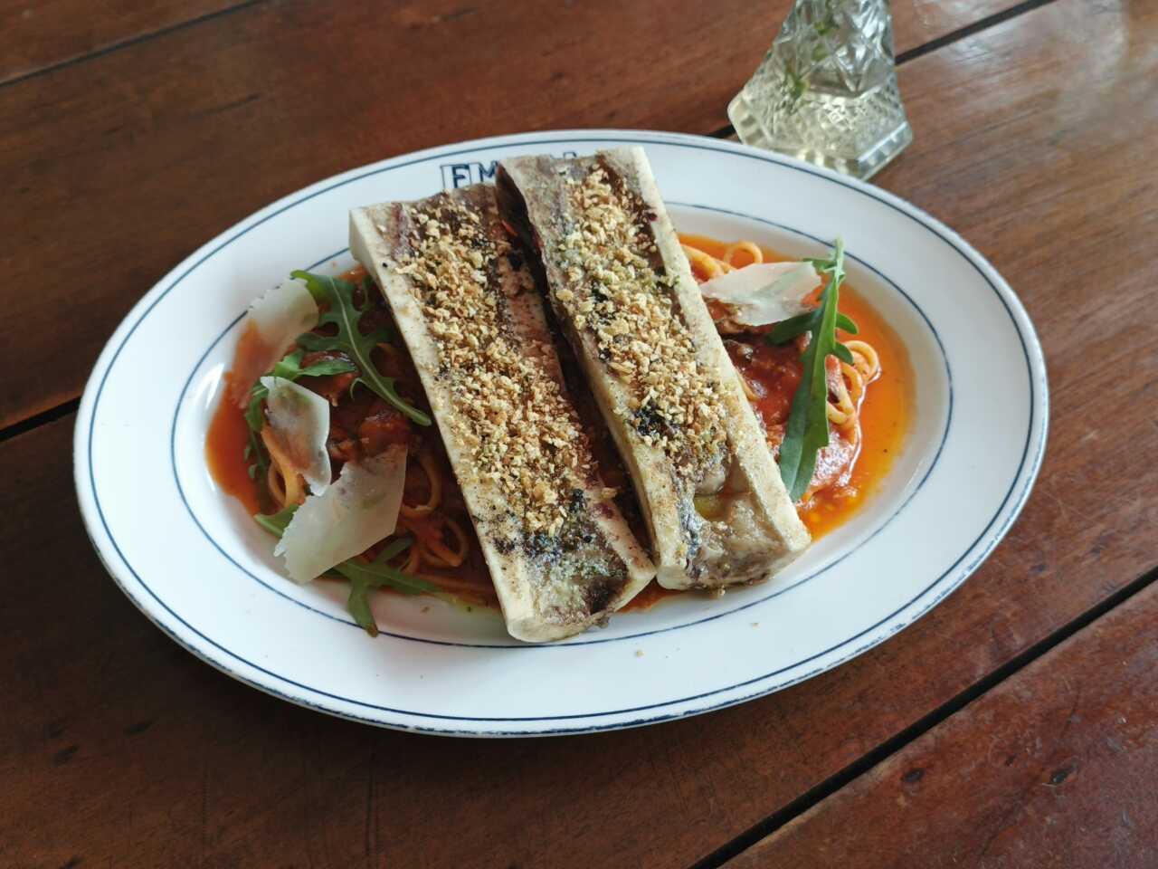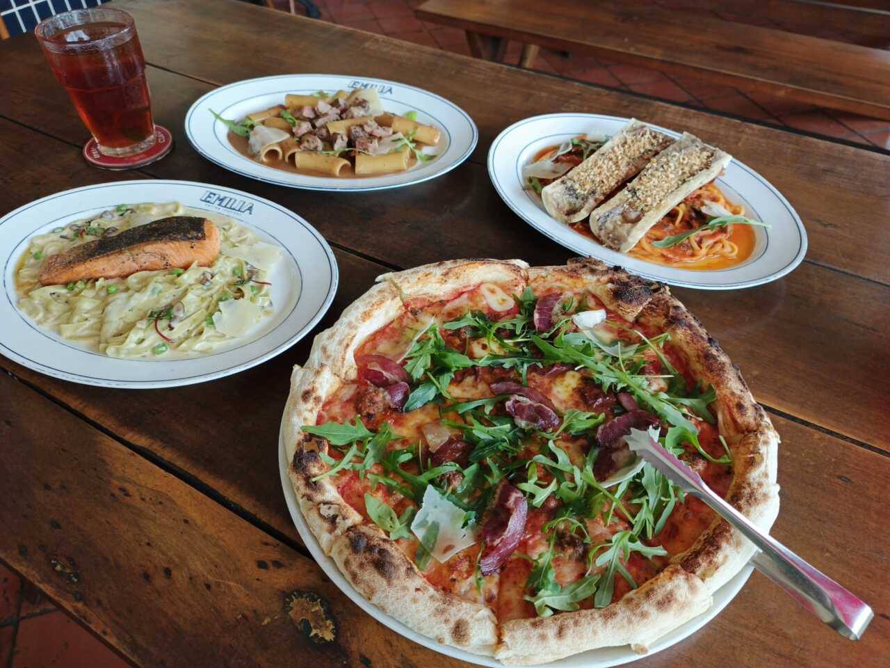 自家製アラビアータソースで仕上げた「骨髄入りリングイネ」や、ノルウェーサーモンがぜいたくにのった「ほうれん草フェットチーネ」は、ぜひ試してほしい。柔らかな自家製生地にミートボールやビーフラグーをたっぷりのせたピザもおすすめ。シェアしたいボリュームの料理&終日営業なのでビジネスシーンや大人のくつろぎ時間にいかが。