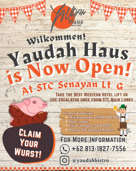 「スナヤン」エリアの「STC Senayan」に豚料理を提供する「Yaudah Bistro」がオープン。開店を記念して、8月30日(土)までRp. 400,000 以上購入すると、「ヴルスト(ドイツソーセージ)」を無料でゲットできるプロモーションを実施中。