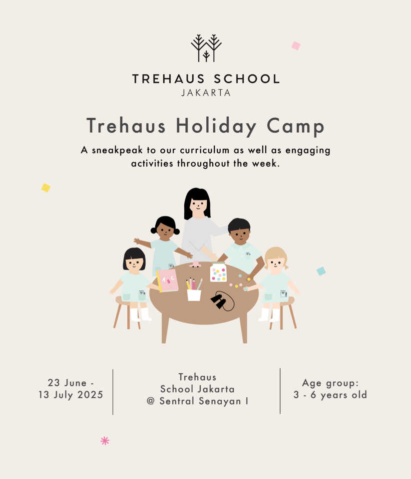 6月23日(月)から7月13日(日)まで、「スナヤン」にある幼稚園「Trehaus School Jakarta」は「Trehaus Holiday Camp 2025」を実施する。3歳~6歳向けの感情管理・科学・料理キャンプに参加可能。参加費は1日ごと、コースごと、3週間全体で支払いが可能。申込はQRより。