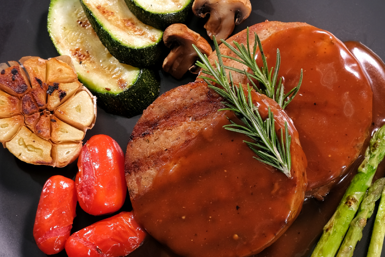 97.5%純鶏肉を使用、粉なしで仕上げた贅沢ステーキ。濃厚なデミグラスソース付き。
