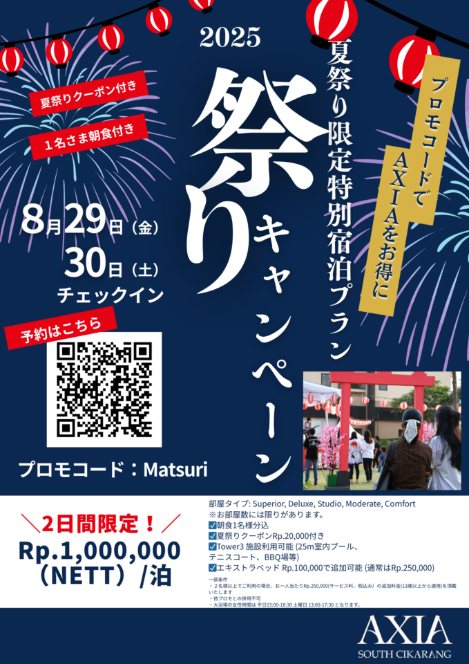 イベント期間限定で、お得な宿泊キャンペーンも実施中!夏祭りを機にAXIAにお安く泊まってみませんか?