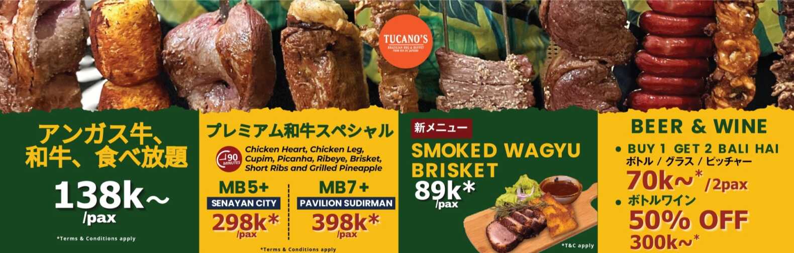 厳選したブラックアンガス牛や和牛を好きなだけ堪能できるのがここ「Tucano’s」。パビリオンアパート内の他、スナヤンシティやメルキュールシマトゥパン内など、中央~南エリアにお住いの方にとって使い勝手がいいのか嬉しいポイント。シュラスコ食べ放題はもちろん、店舗によってラインアップが異なるビュッフェはどれも主役級のおいしさです。
