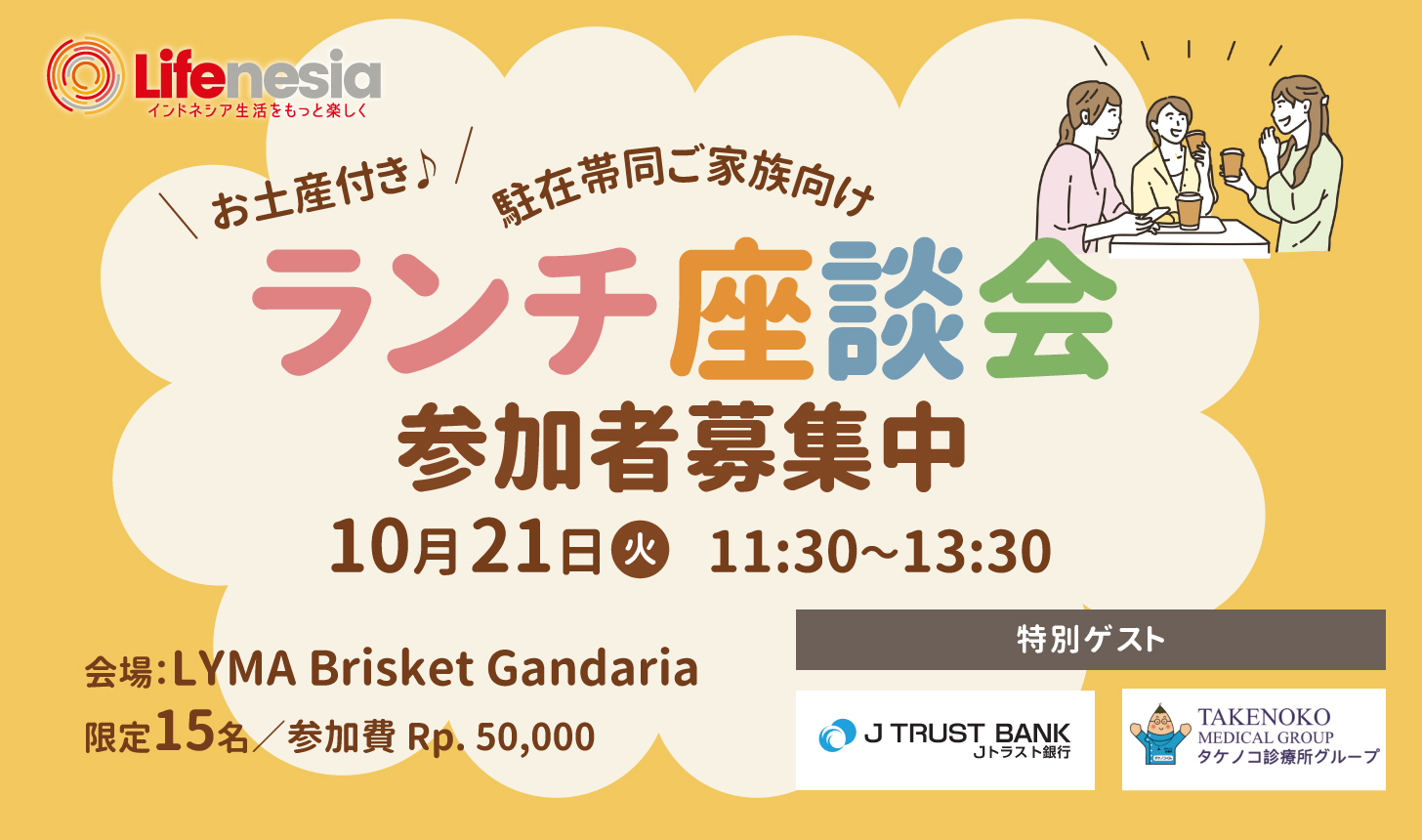 | 参加費 | お1人様 Rp. 50,000 (当日現金にてお支払いください。) 嬉しいお土産付き♪ |