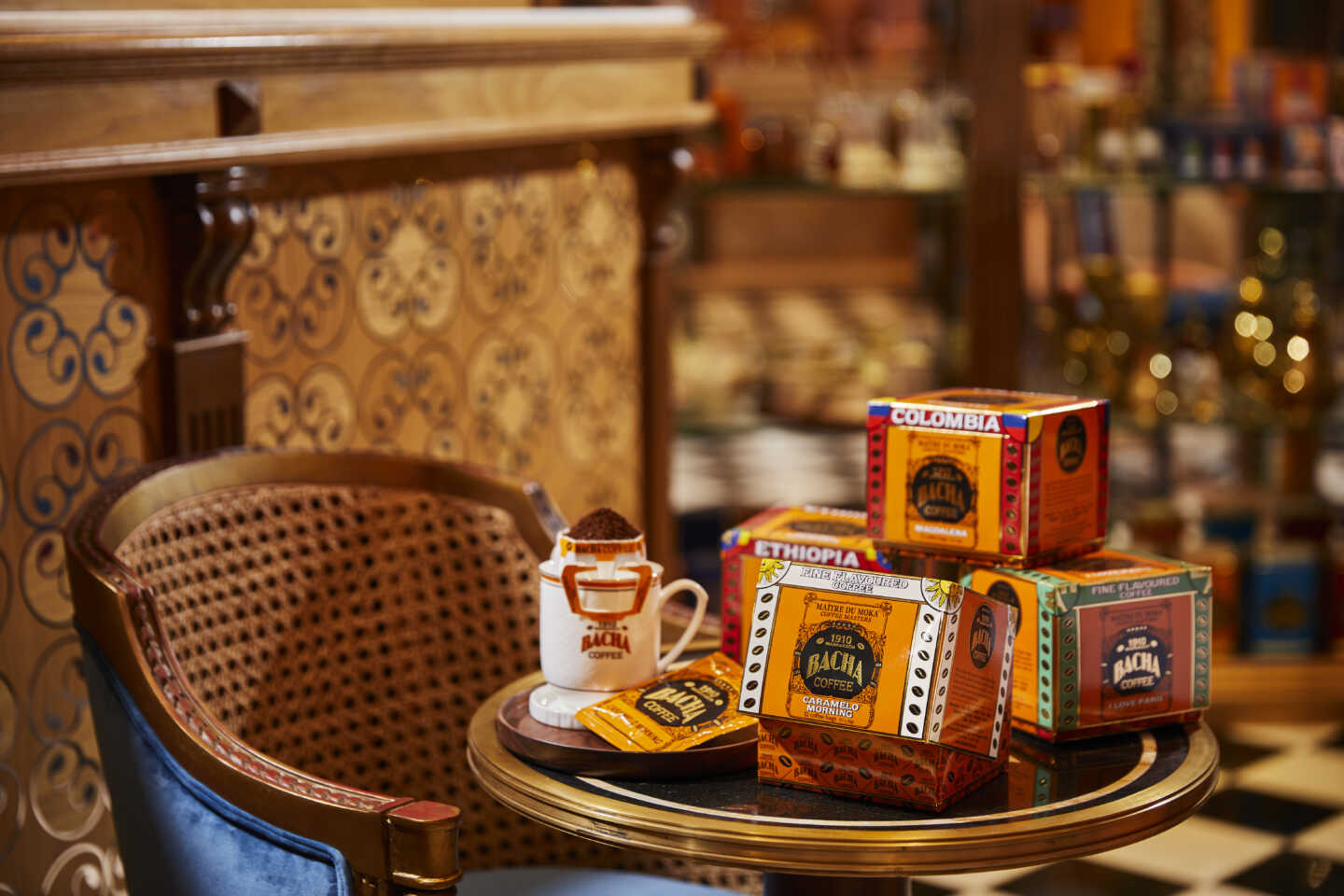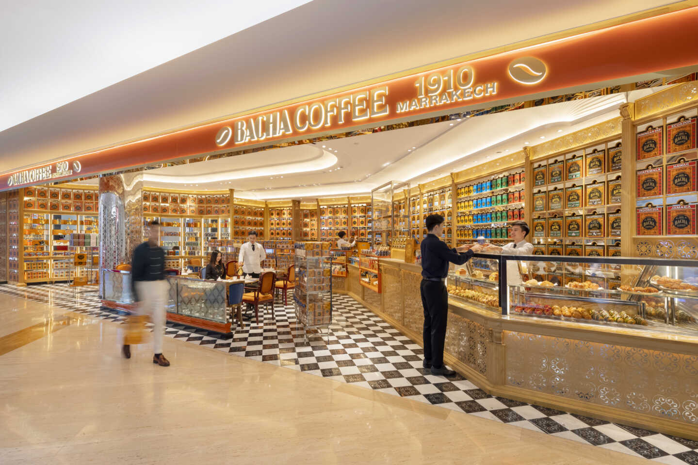 約120年前にモロッコのバシャ宮殿内で誕生した珈琲が2019年によみがえり、シンガポールを皮切りにASEAN、香港や韓国、フランスやUAEなど世界中に展開する同店。日本では今年初旬に上陸し、日本人にも支持が高いコーヒーショップだ。遠くからでも一目瞭然の黄金に輝くインテリアコンセプトが印象的。