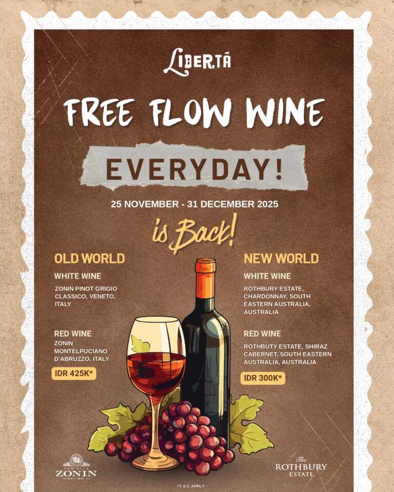 12月31日まで毎日、ワインのフリーフローが楽しめる。イタリア産やオーストラリア産の白ワイン、赤ワインをご用意。価格はRp.300,000から。
