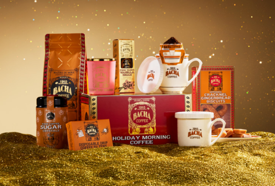 ミルクチョコレートと濃厚キャラメルが加わった100%アラビカ種のスペシャリティコーヒー「ホリデー・モーニング・コーヒー」(Rp. 848,000)やホリデーモーニングハンパー(Rp. 4,511,000)などを用意。12月より全Bacha Coffeeブティックで販売。