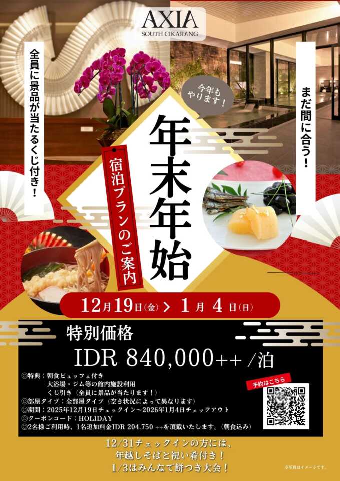 今年もクリスマスがやってきました。「AXIA South Cikarang」では、各テナントでのクリスマスシーズン限定企画と、まだ間に合う年末年始プラン、新しく登場した週末限定の新プランをご紹介します。この機会に是非AXIAに滞在してみては如何でしょうか。