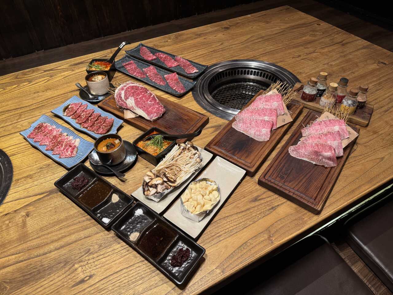 人々が行き交うグナワルマン通り。品格ある外観に赤いのれんが目印の同店は、無造作に貼られたステッカーや懐かしい音楽が昭和レトロで気取らない居心地の良さを感じる。1人向けのランチや定食もあるが、グループで利用するなら「大名定食」がコスパ抜群。USプライムの特上カルビや焼きしゃぶ、ハラミ、希少なフルブラッドの特上ヒレと、ぜいたくな肉がそろう。サシが入った肉は見た目も美しく、ごはんやワカメスープ、食後のデザートが含まれ、店自慢の味を余すことなく堪能できる。