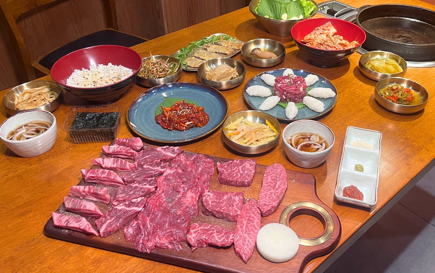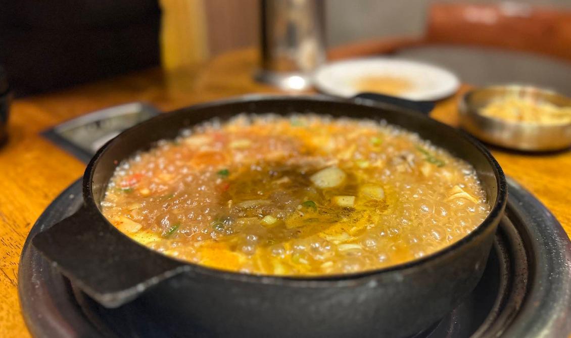 おススメは「シェフおまかせセット」。4~5種部位が一度に食せるお得な内容だ。サムジャン味噌や塩、ごま油で堪能する。締めは人気の「テンジャン飯」を。野菜とうま味が効いた韓国味噌鍋にご飯を混ぜていただく韓国スタイル。チカランでの会食に利用したい一店だ。